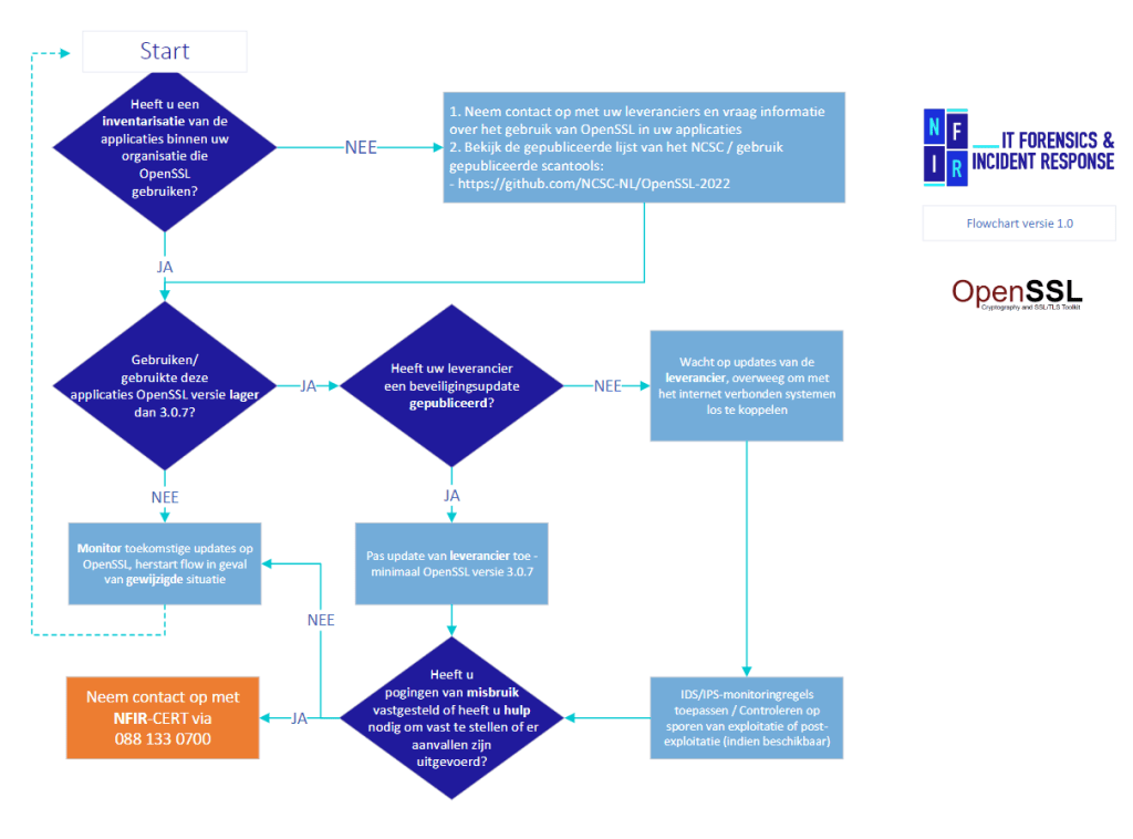 Om u te helpen met het nemen van de juiste beslissingen hebben wij een OpenSSL flowchart voor u uitgewerkt. Deze flowchart helpt u de juiste keuzes te maken met de informatie die er op dit moment beschikbaar is. Gezien de ontwikkelingen is het raadzaam om deze pagina en ons Threat Intelligence Report regelmatig te bekijken. Deze worden namelijk bijgewerkt zodra nieuwe informatie beschikbaar is.